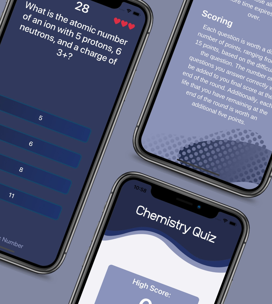Chemistry trivia iOS app built with Swift which allows Park Tudor Upper School students to study for their chemistry final exams while also having fun competing against their classmates!